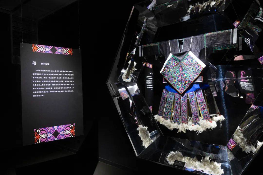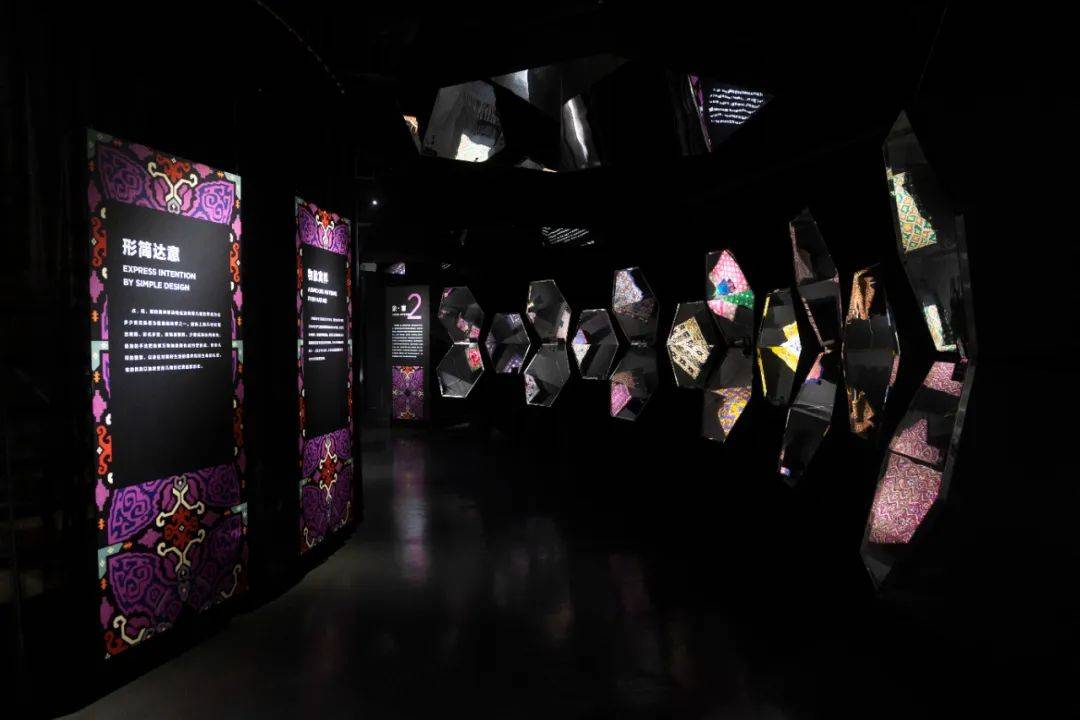 展陈设计独具匠心。展览主视觉的设计来源于万花筒的图形构成创意,用万花筒对称排列成新的视觉图案,交织出西南少数民族服饰追求意象美的生活美学。展览主视觉上的四个图案,是展览四个部分的代表性图案的变形。展览空间采用了艺术装置与陈列并行的方式,将场景、设计、文字、展品融为一体,将少数民族生活的环境、节日的场景、服饰的色彩与纹饰一一解构重塑,融入到展厅的艺术装置当中来阐释人与自然和谐共生的关系,从多种全新的视觉角度向观众呈现民族服饰之美。