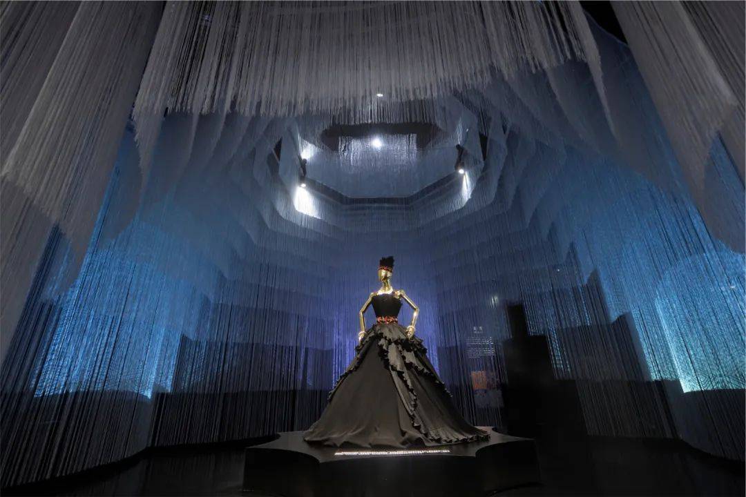 展出的服饰,由意大利著名设计师Giancarlo Mossi Borella先生专门为本次展览设计制作。他从中国西南少数民族服饰元素中获得灵感,结合西方时尚艺术进行创新。服饰颜色为黑色,上衣及下裙外层纱采用褶皱处理,源于中国西南少数民族以黑色为贵的审美习俗和百褶裙理念,并点缀创新的少数民族手工艺腰带、头饰和配饰。服饰整体简约沉稳,彰显立体感,充满时尚感,既引领现代审美潮流又具有优秀民族传统文化内涵。