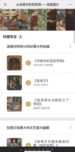上海博物馆微信导览精选展览中21件最具代表性和故事性的重磅作品,提纲挈领地串联最具教科书意义的艺术流派。在介绍本次展品的基础上,微信导览亦对相关艺术史背景有所解读,并补充了大量拓展性图片,以丰富展览的教育阐释,促进观众对作品的理解。
