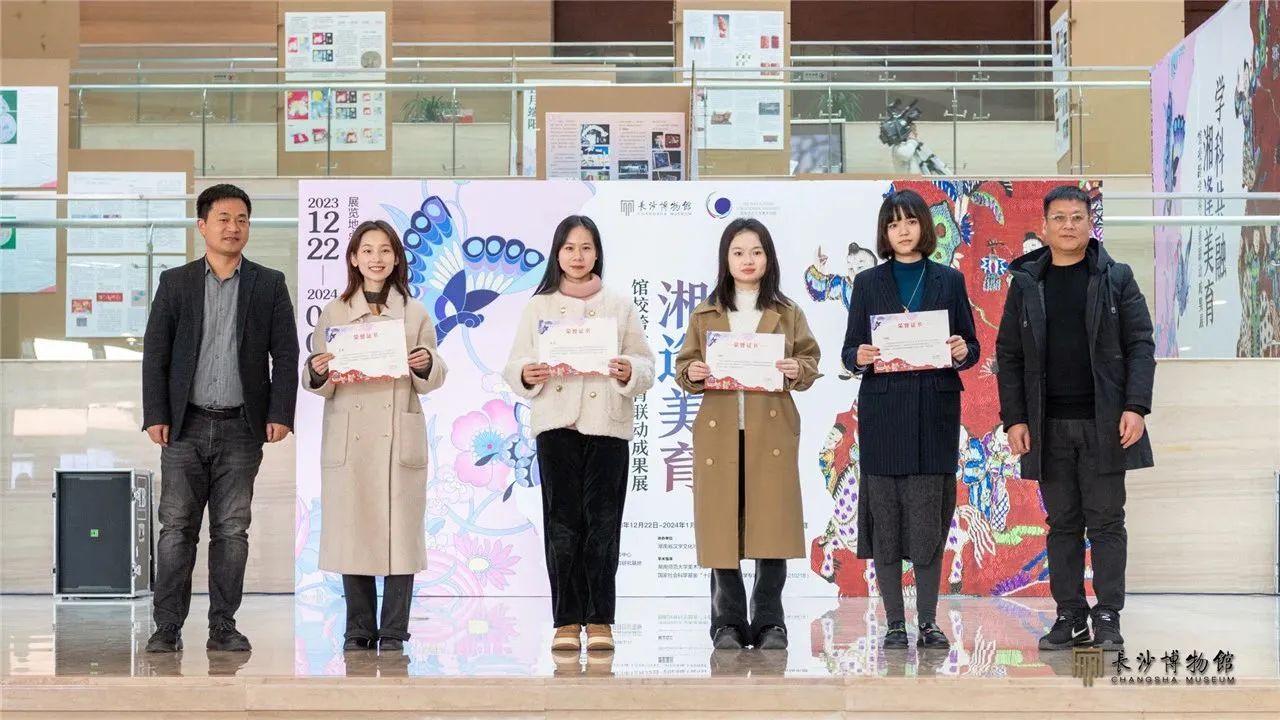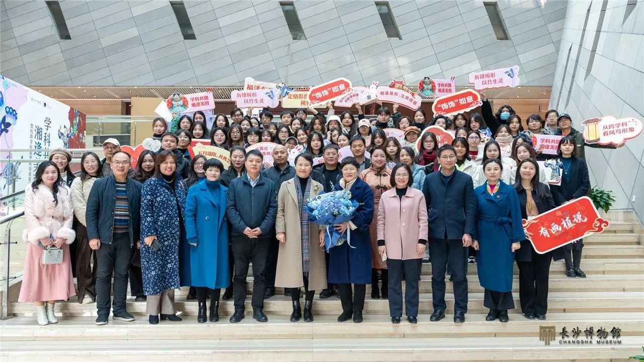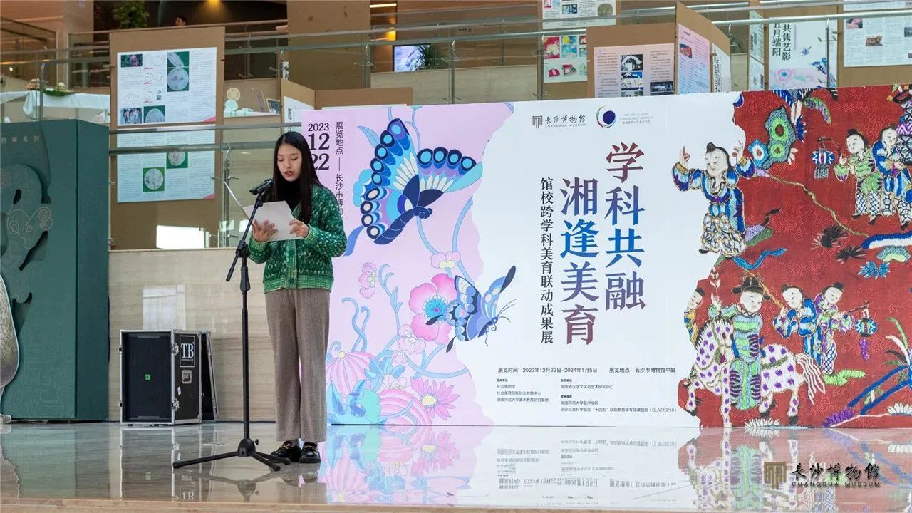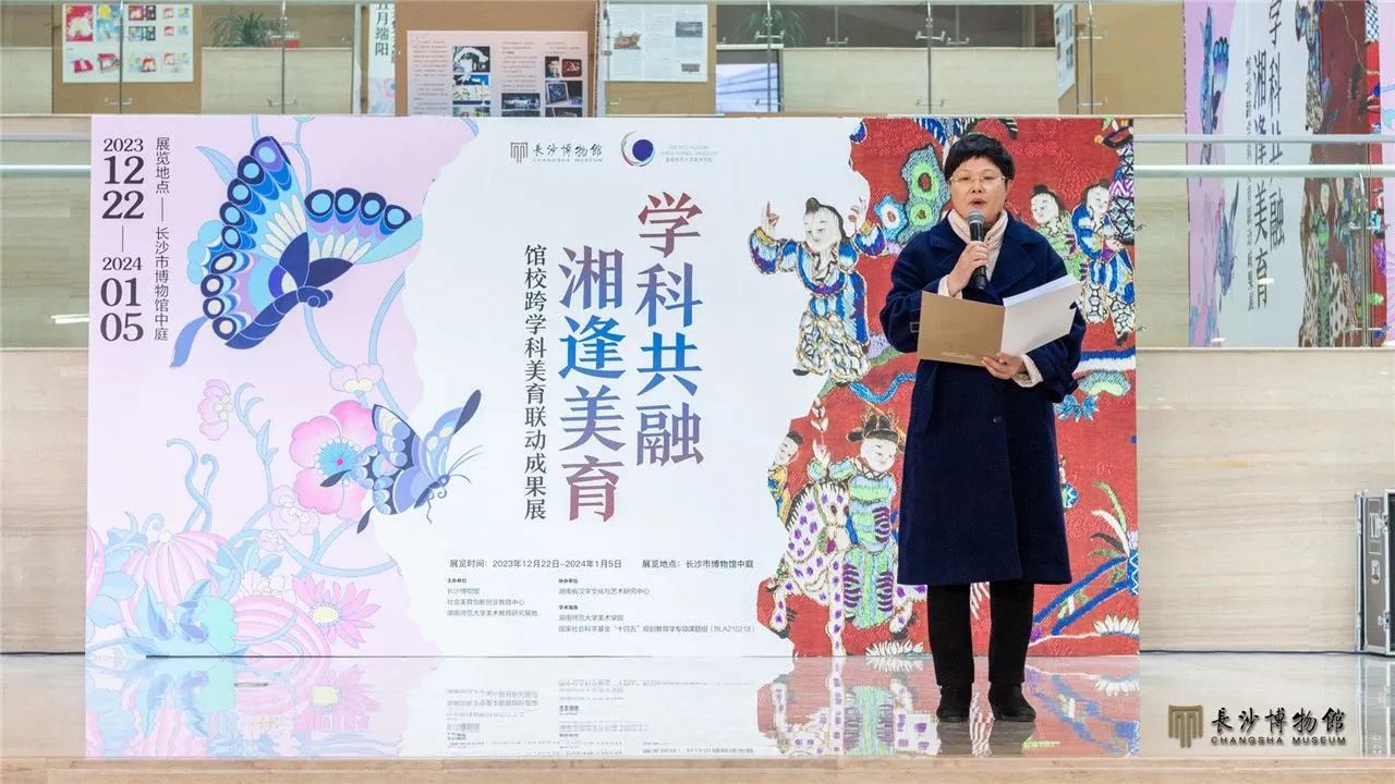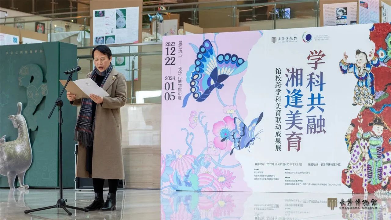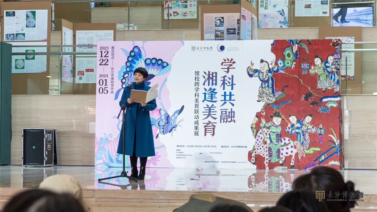 2023年12月22日,“学科共融 湘逢美育——馆校跨学科美育联动成果展示”在长沙博物馆中庭开放。展览开幕仪式上,长沙博物馆馆长周慧雯致辞,湖南师范大学副校长谢资清致辞,湖南省社科联党组成员、副主席贺建湘宣布展览开幕。出席活动的还有湖南省社科联、长沙市文旅广电局相关领导、同志,湖南省、市美育相关机构负责同志、专家、工作人员等百余人。