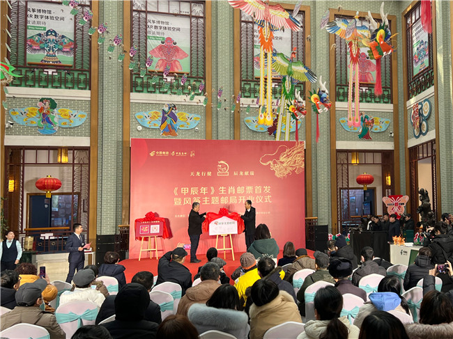 为进一步提升潍坊传统文化影响力,讲好潍坊故事,传播潍坊声音,展示潍坊形象,增强建设更好潍坊的文化凝聚力和推动力,2024年1月5日上午,由潍坊市文化和旅游局、潍坊市邮政管理局、中国邮政集团有限公司潍坊分公司主办,潍坊市博物馆承办的“天龙行健 辰龙献瑞”《甲辰年》生肖邮票首发暨风筝主题邮局开业仪式在潍坊世界风筝博物馆启动。市文旅局二级调研员苗庆安,市邮政管理局党组成员、副局长崔杨,市邮政公司党委委员、副总经理周晓华,市邮政管理局孔祥军等领导出席活动仪式。