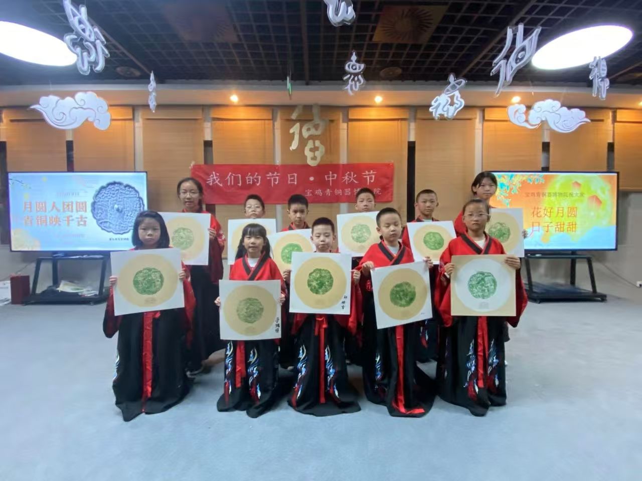 小朋友们展示“唐王游月宫”铜镜主题拓印