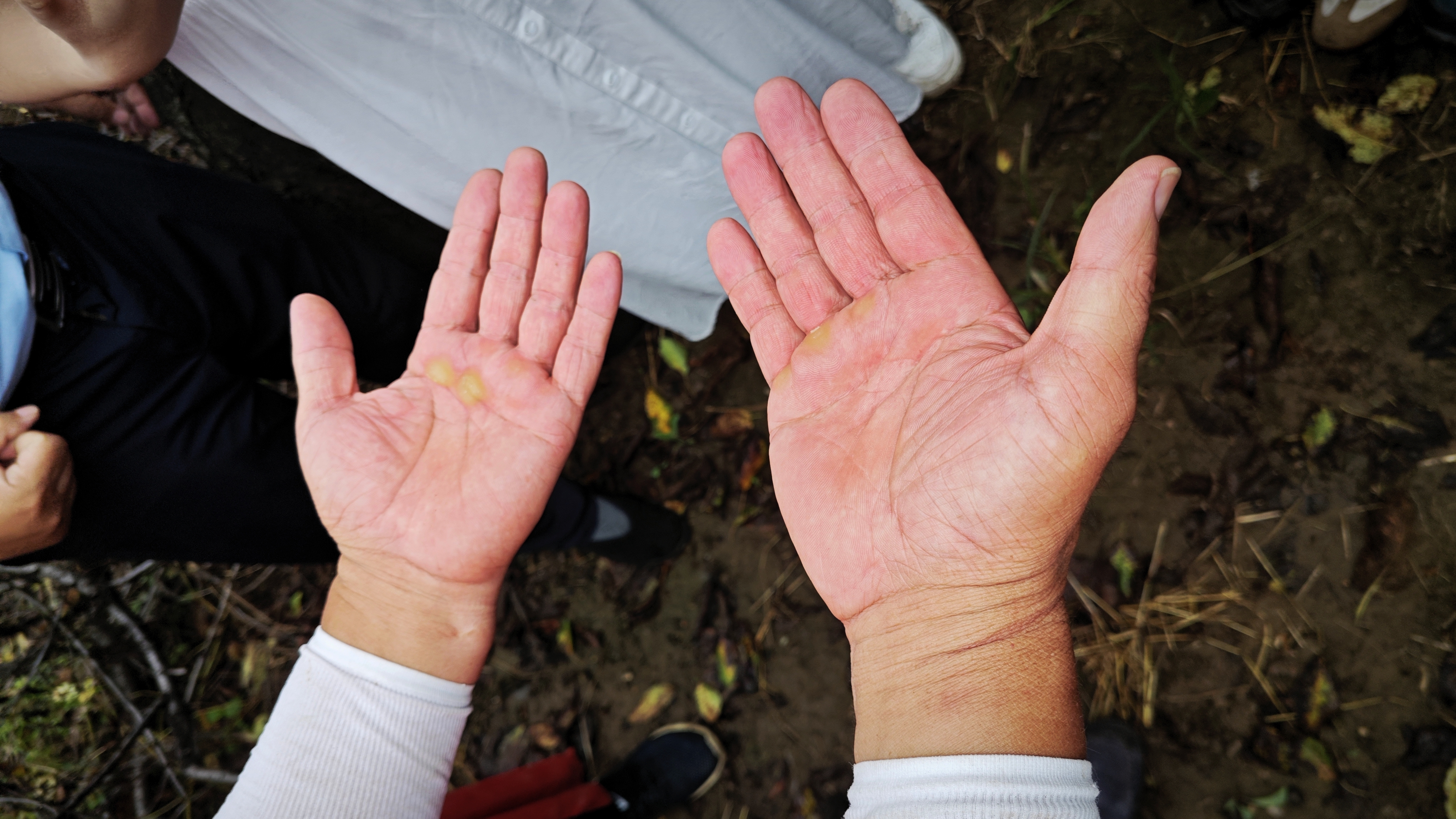 这处遗址的分布范围比第一处更广,从马路边走进樱桃园,穿过玉米地又到荒草地,十几个一米多深的探坑打下去,遗址的范围才逐渐清晰。两处遗址测完,所有人的鞋底和裤脚已经全是泥巴。