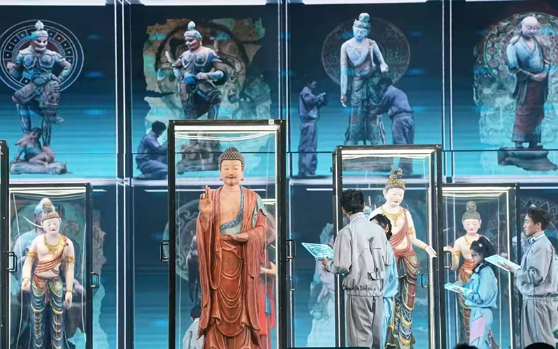 15米高佛陀“数字”巨像顶天立地,舞台上的彩塑造像法相庄严,穹顶是敦煌藻井图案华美繁复,光影交织间,一幅横跨巴黎、敦煌两地百年守护、千年传承的敦煌长卷在观众眼前徐徐展开。