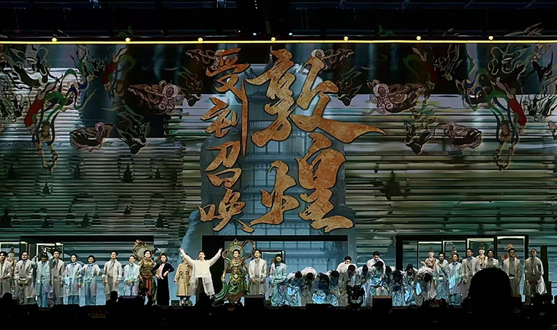 “古往今来千百载,石窟记录下的时代,一笔一划都诉说璀璨的过往,那文化交融思想碰撞。”舞台上扮演帝王将相、匠人僧侣的演员们用唱词回溯敦煌的过往。汉武帝派遣张骞出使西域,遥远的长安与神秘的西域在驼铃声声中紧密相连,敦煌成为这条路上熠熠生辉的明珠。公元366年,乐僔和尚来到敦煌,见三危山上霞光万丈、似千佛显现,于是凿下第一座洞窟。此后,经过长达一千多年的营造,莫高窟成为世界上历史延续最悠久、内容最丰富、艺术最精美的佛教艺术遗存,735个洞窟、2000多身彩塑、45000平方米壁画荟萃灿烂文明,向世人展现出一幅多元交融的壮阔图景。敦煌,是古老的丝路重镇,是华戎交汇下成就的历史传奇。