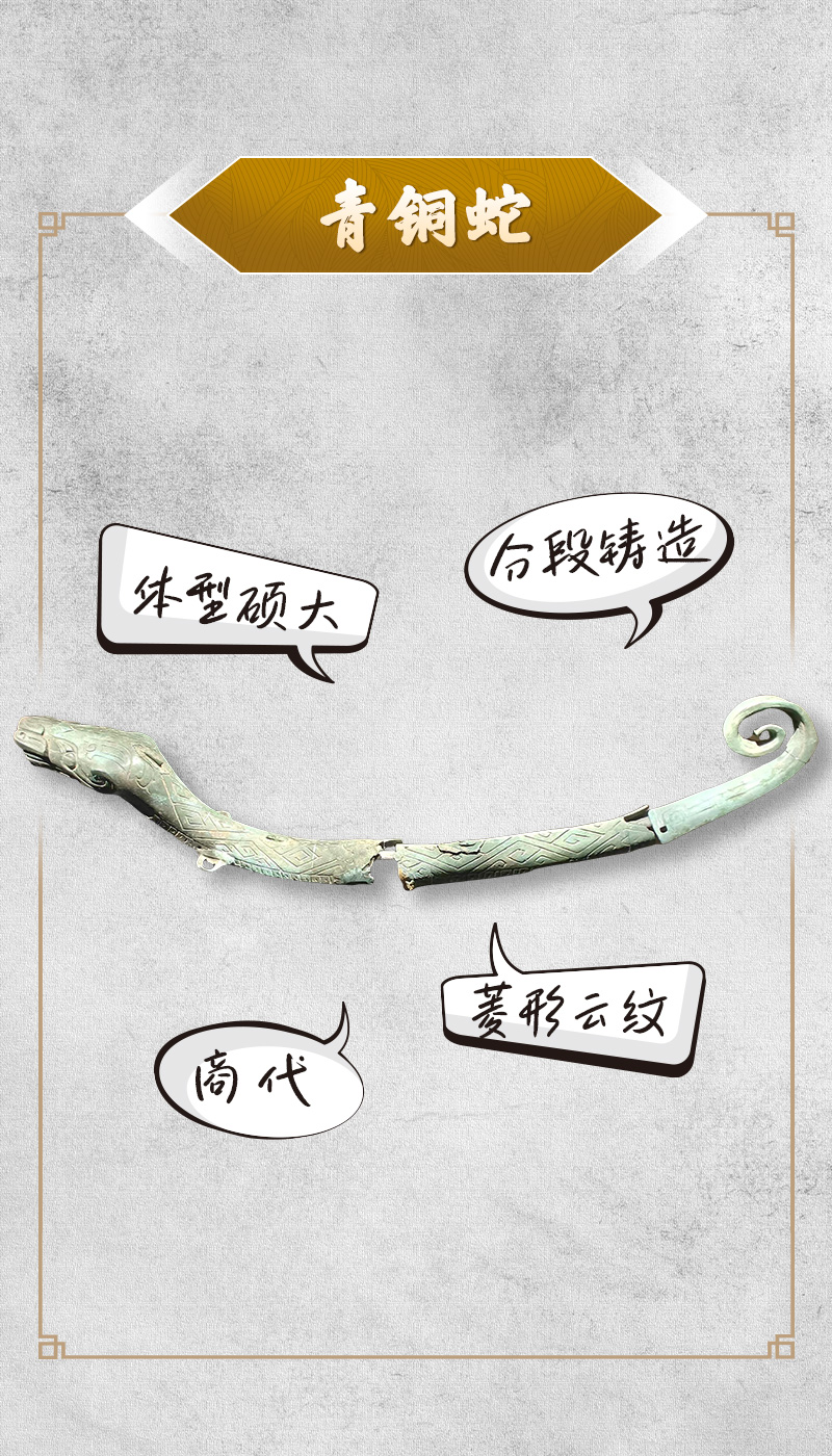青铜蛇1986年出土于四川省广汉市三星堆遗址,现藏于三星堆博物馆。青铜蛇体形硕大,蛇身残长34.5厘米,头残长29.9厘米。蛇身饰有菱形纹和鳞甲,蛇颈下和腹部装有环钮。专家推测,环钮可能挂在某种物体上将青铜蛇作为神物膜拜。