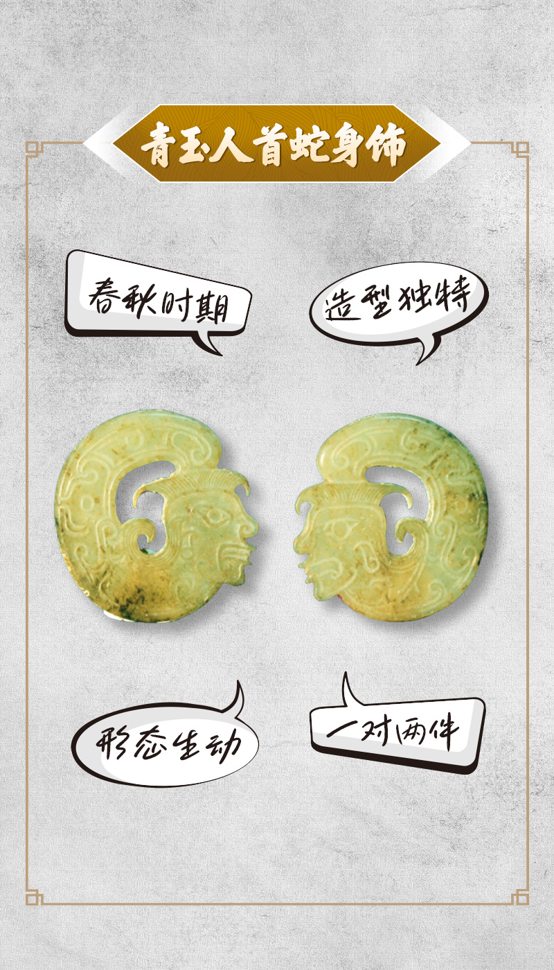 青玉人首蛇身饰1983年出土于河南省光山县黄君孟墓,现藏于河南博物院。外径3.8厘米、厚0.2厘米。这对青玉人首蛇身饰均呈扁平椭圆环状,大小薄厚相同,玉饰呈青黄色,人首与蜷曲蛇身构成环状。人首五官清晰,覆舟式头发,在头形边廓内勾勒一道复线,以突出五官。