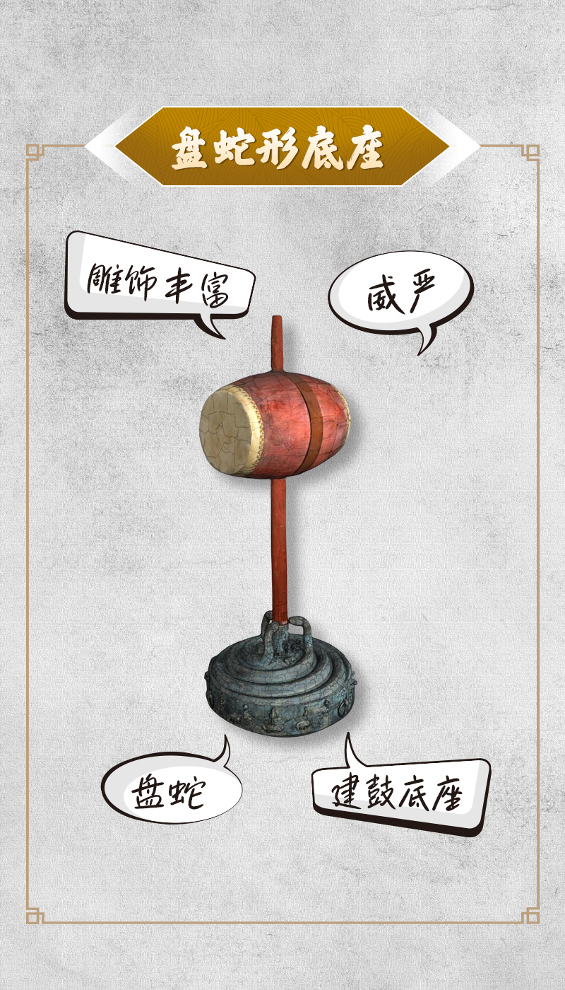 “别看我个头不大,我可是目前国内发现最重的青铜建鼓底座,足足有80公斤呢!在我生活的战国时期,建鼓是一种高等级的礼仪乐器,负责沟通天地人神。肩负着这么重要的使命,我可得把稳重心站好喽。我身上的3条蛇昂首盘绕、生动逼真,显示着使用者的威严。”