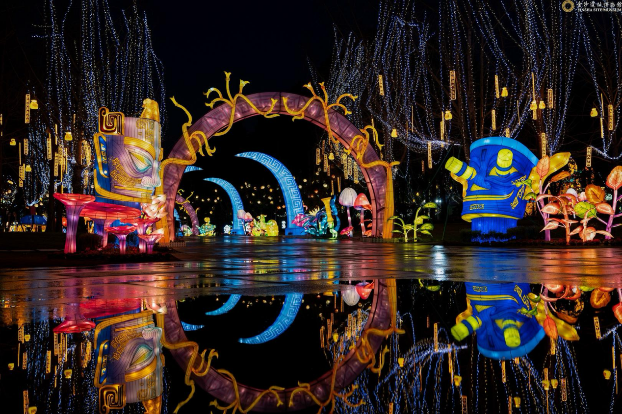 金沙遗址博物馆里,灯光璀璨。1月27日晚,随着灯组次第点亮,金沙遗址博物馆瞬间变身光影世界,2025年成都金沙太阳神鸟节如期举行。现场12组大型主题灯组、数十余组中小型灯组及数千余串氛围灯,呈现“古蜀文化”“遗产大观”“太阳崇拜”“福蛇迎春”四大板块内容,点亮超4000平方米古蜀家园。