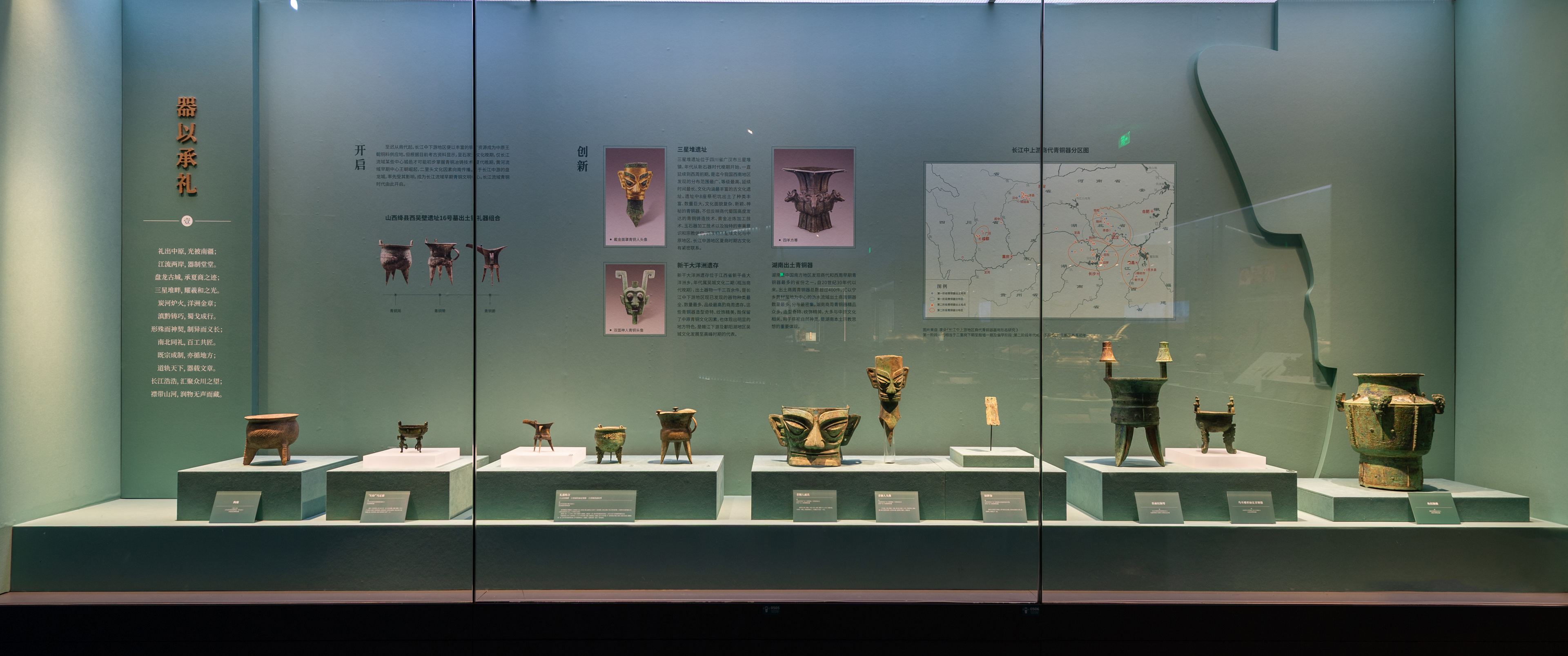 展览尝试以意象化的表达,建构地理与历史的时空联结,将长江不同区域水文特征比拟于中华文明不同发展阶段。展览内容分为“欢腾·星斗”“汇聚·璀璨”“磅礴·辉煌”三大篇章,每篇各设三至四个子版块,总体合成11单元,喻指长江干流11省(区、市)。第一篇章:欢腾·星斗,溯及百万年时空,自远古人类之遗迹,到耕织生业之余响,直至五千年文明初章。通过展示良渚之城、宝墩之邑、石家河之纹陶、凌家滩之成玉等早期中华的多元谱系和共同基因,揭示长江与黄河并肩为源,交相呼应,于万象初生中携手孕育中华文明的生命根系。第二篇章:汇聚·璀璨,记述长江以器物之创造、制度之承载、思想之共生,为中华文明贡献营养与活力。通过展示盘龙古城、三星堆畔、炭河炉火、滇黔铸巧、蜀戈成行等器礼遗存,揭示长江流域技艺薪传、文教渐繁、庶政有端,在中华文明形成与发展中的重要价值。第三篇章:磅礴·辉煌,探究长江流域引领政治思想之变革,催生经济民生之繁荣,承载文教兴邦之理想,亦开启对外交往之通途。通过展示岳麓讲堂、江南织造、策论科举、戏曲画卷等文华物证,揭示长江流域于宋元以降的文明演进及舟载交融。