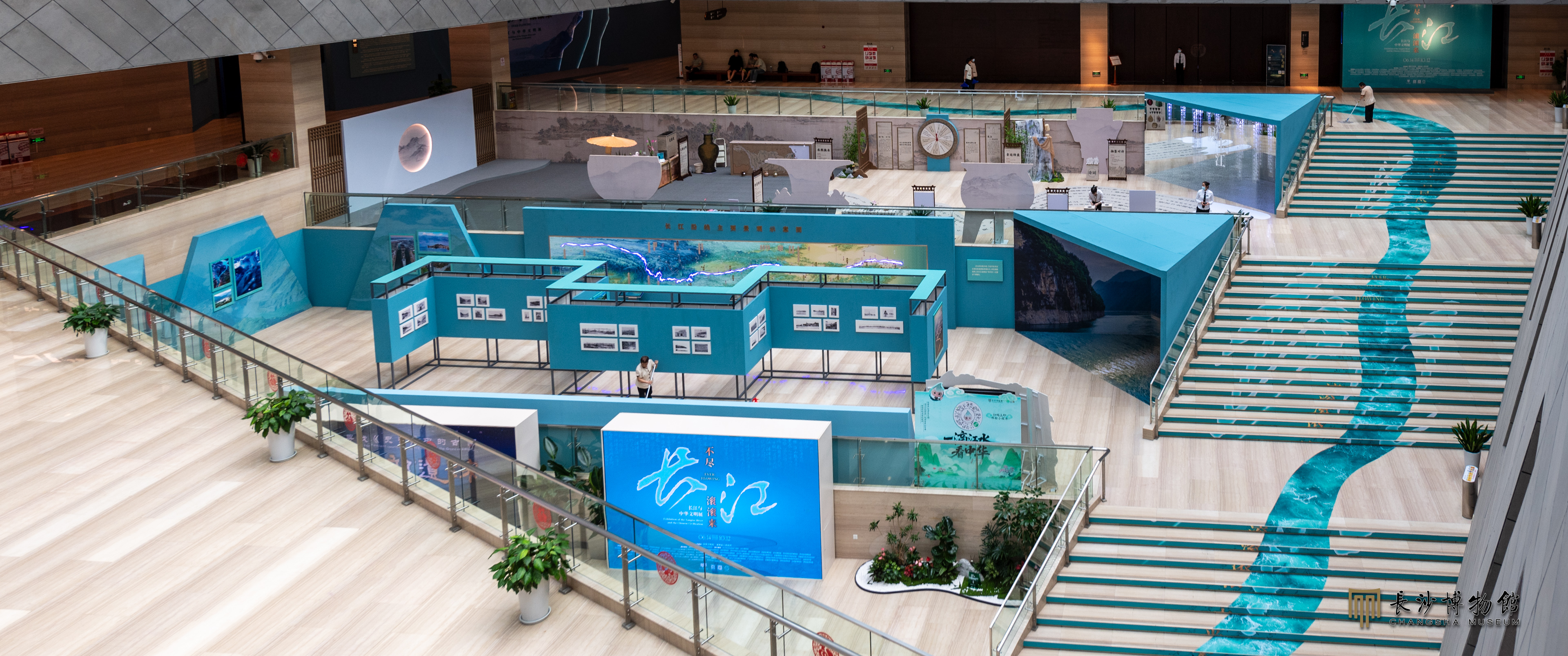 展览在展陈设计方面大胆创新,深度融合长沙博物馆展厅内外建筑空间,以巨大穹顶的中庭作为大序厅,将三级台阶布置成展览的伏笔,通过教育活动、互动体验、数字展示等形式,营造长江自然地理与文明传承的意境体系,为理解欣赏展品提供良好视角和切入点。观众进入博物馆即可“溯流”而上,感受长江流域文明演进,览阅万里江河文化盛景。