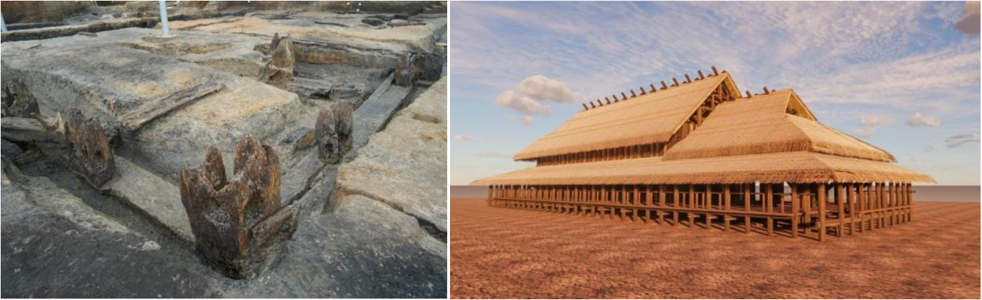 鸡叫城遗址另一个重要发现是大型木构建筑基础。2020年,在城内西部发现了一座编号为F63的完整建筑基址,长40米,宽约10米,主体建筑包含五室,其中两室还分为前后间,外围设有廊道,总面积达600平方米。建筑基址内的木柱多为樟木和楠木,保存状态极佳。经北京大学徐怡涛教授团队复原,该建筑可能为干栏式结构。