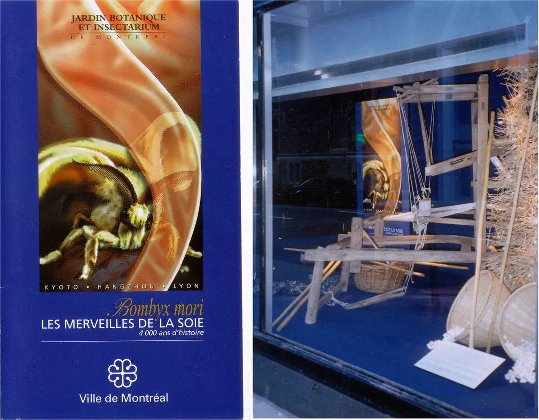 1995年加拿大蒙特利尔植物园展“桑蚕蛾:了不起的丝绸”海报及商场橱窗里的织机