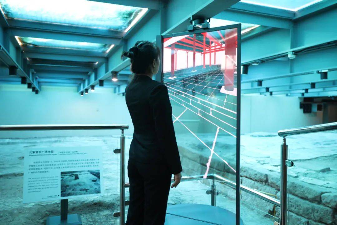 让这一目标部分实现的一个关键技术是MR。技术人员在南汉国二号宫殿的位置,设置了一组由OLED透明屏、旋转平台和眼球追踪系统三者结合的系统,实现复原建筑在遗址空间上的准确定位。记者在现场体验了一下,发现随着自己视线高度、角度的变化,显示在透明屏上的宫殿图像也在不断变换角度。项目技术方、上海美岚展览工程有限公司负责人陆旭介绍,虚拟图像和透明屏背后的遗址是实景匹配的,屏幕上看到的柱子,就是遗址里那些磉墩,“这种技术就是让大家明白究竟遗址的各个地方,原来是些什么东西,是什么样子”,他说。这也是全国首次将MR、OLED透明屏及眼球追踪技术整合运用到大遗址数字化展示中。
