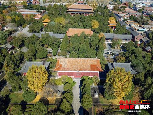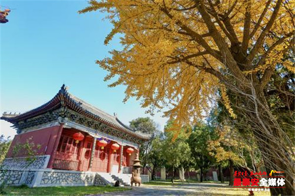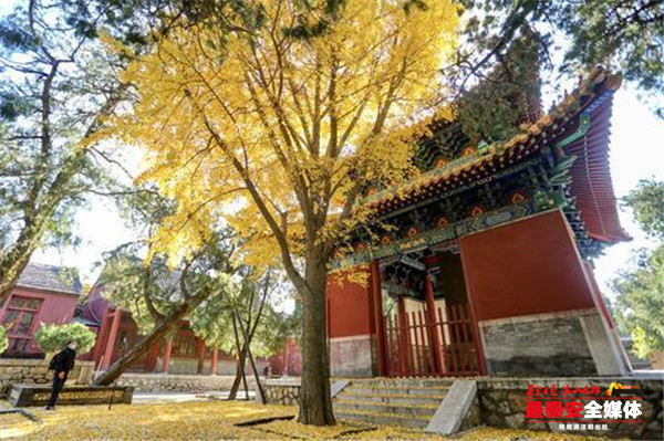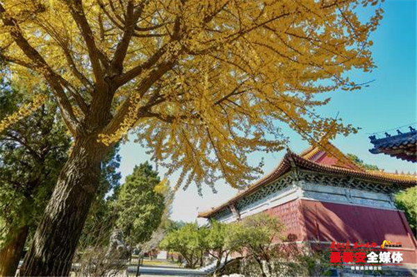 岱庙院后寝宫殿前两侧台阶下各有一株苍老的银杏树,树龄均340多年,其中一棵树高27.5米,另一棵树高31米,树干通直挺拔、长势强健、冠如华盖,黄叶似金,堪称岱庙一绝。分布在岱庙配天门南侧及天贶殿南侧的几棵银杏树此时也格外显眼,站在树下抬头望去,树枝上一簇簇的银杏叶在阳光的照射下闪着金光,繁茂的树叶中间,藏着一只只鸟儿,啁啾声阵阵似是在窃窃私语,偶尔游人经过,交谈中惊起一群飞鸟,扑棱着翅膀飞远。