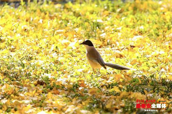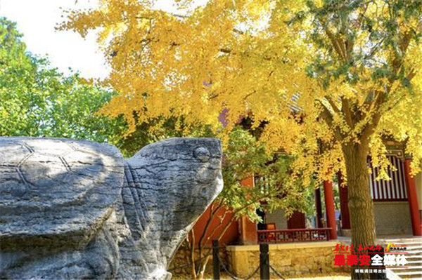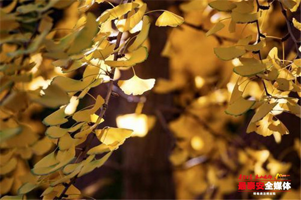 一片片银杏叶如同一把把小巧玲珑的扇子,微风吹过,发出“沙沙”的响声,叶子腾空而起,像是蝴蝶般四处飘飞。银杏叶落到板凳、石龟、石碑上,为古朴的岱庙增添了一抹亮黄,落到青石板上、草坪中,织就一条条金黄色或是块黄绿相间的地毯,让人不忍踏足。