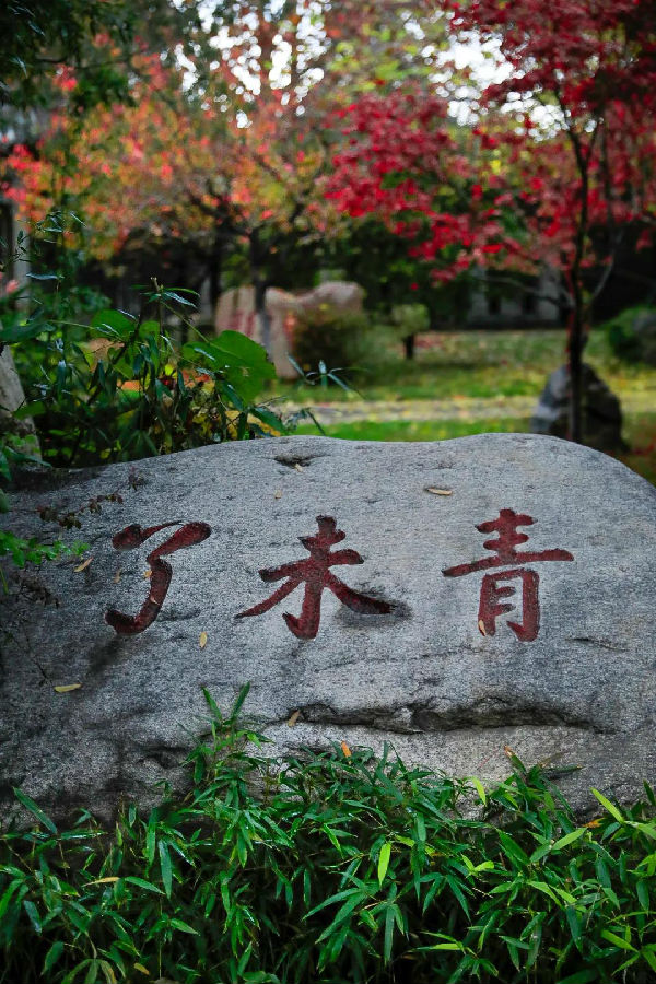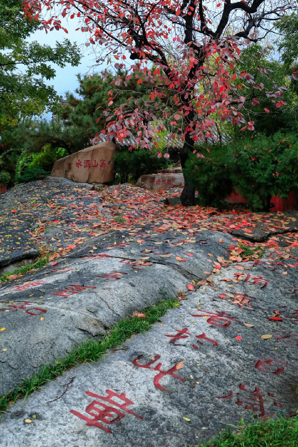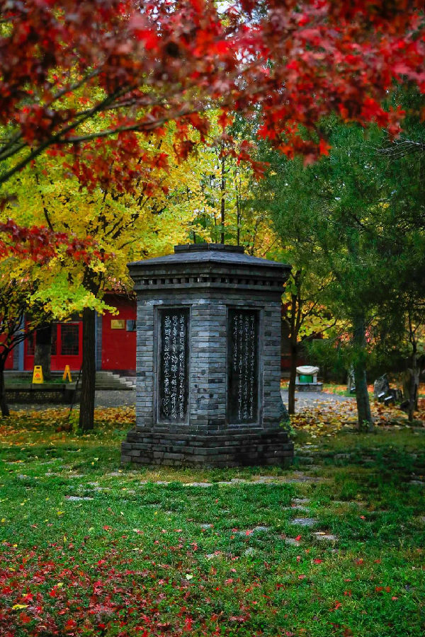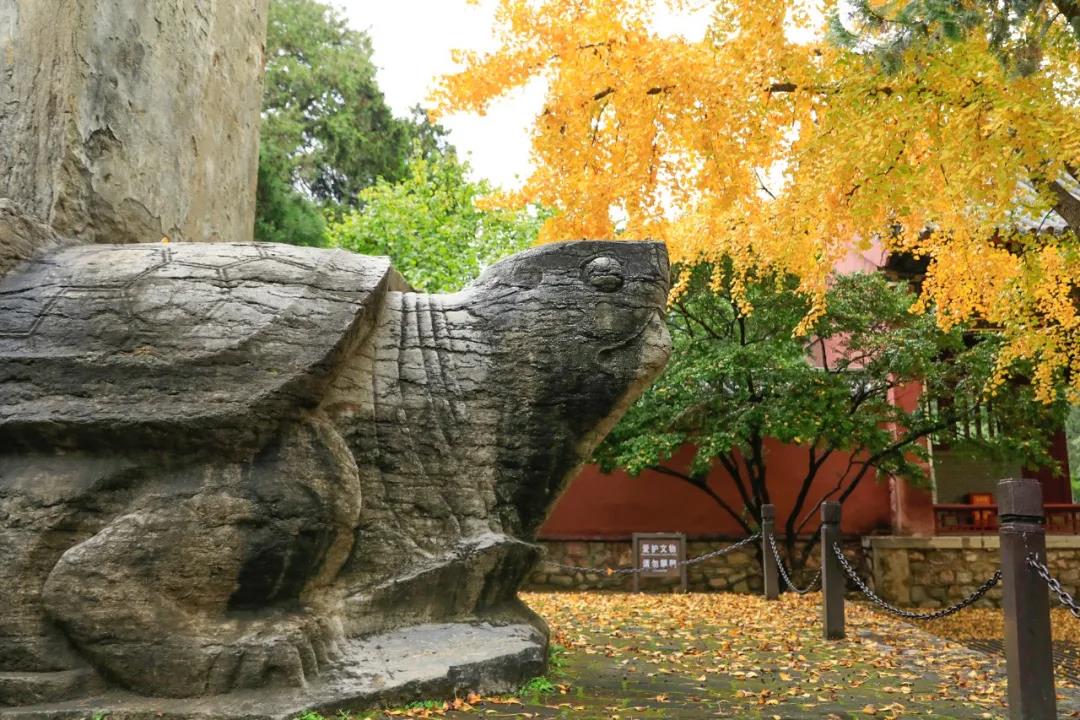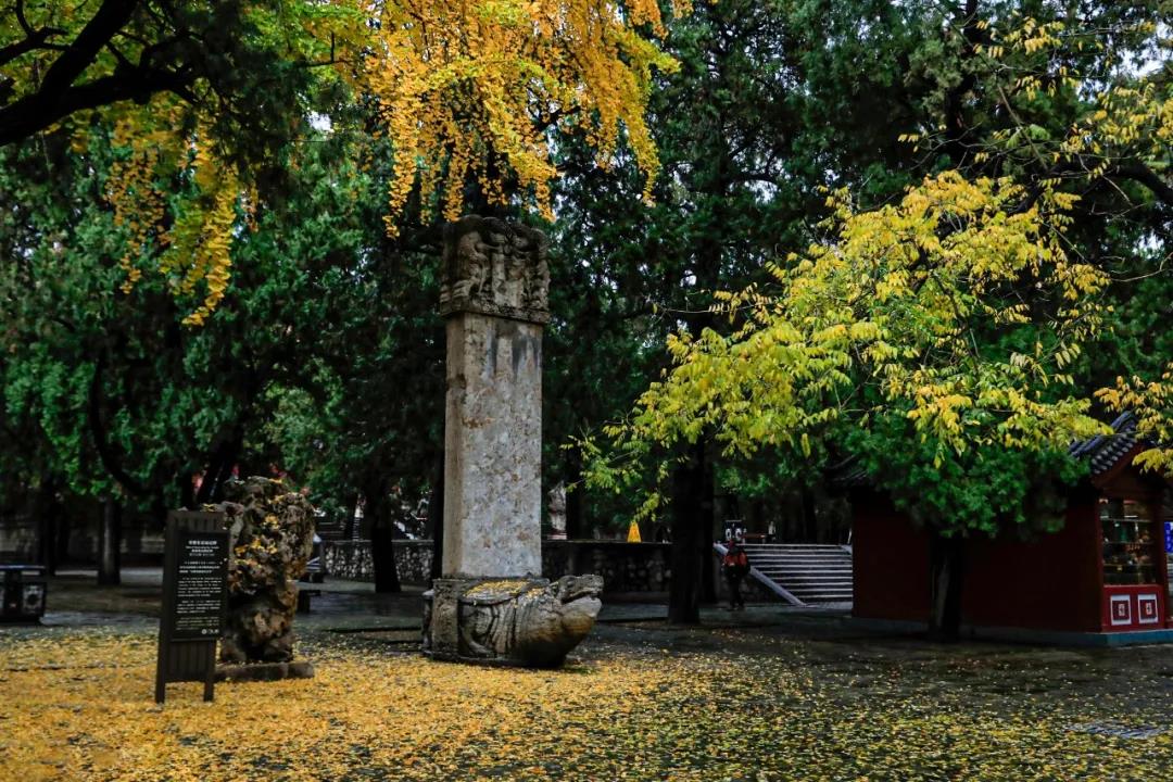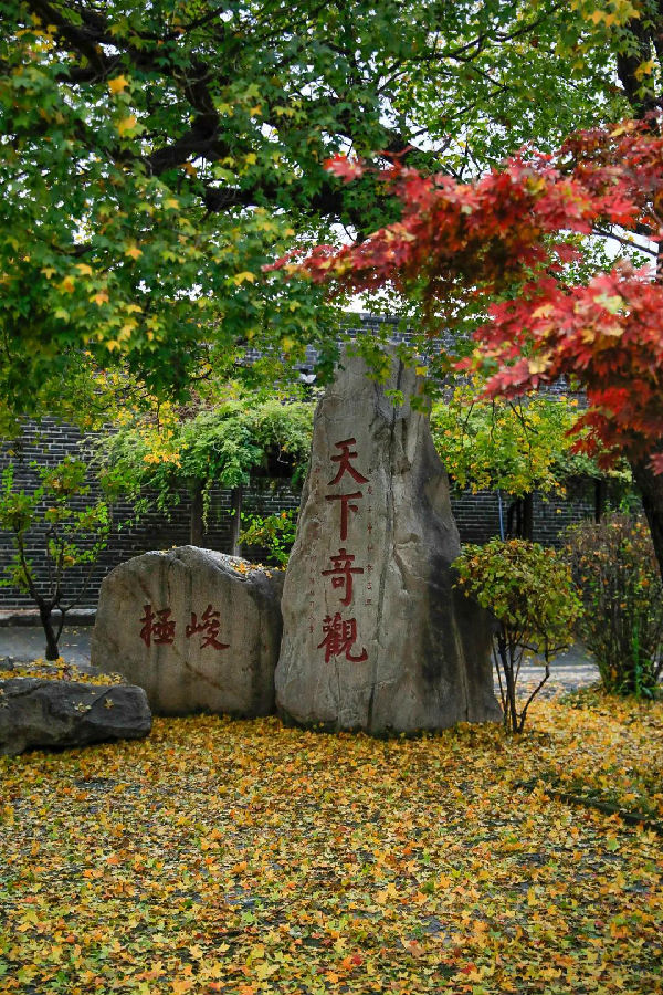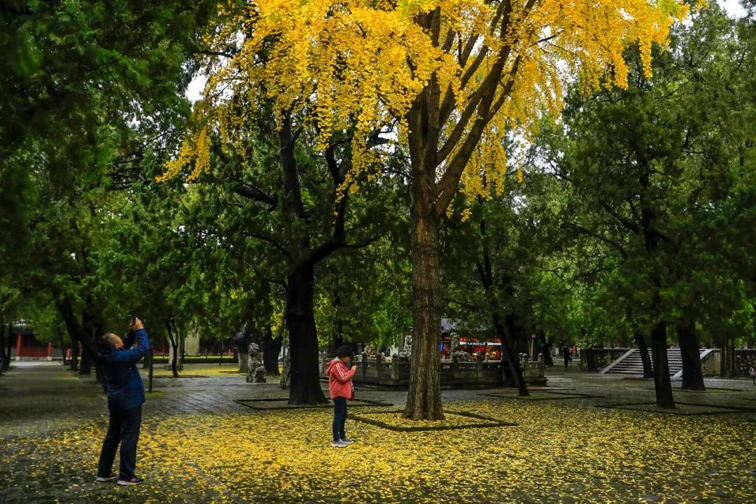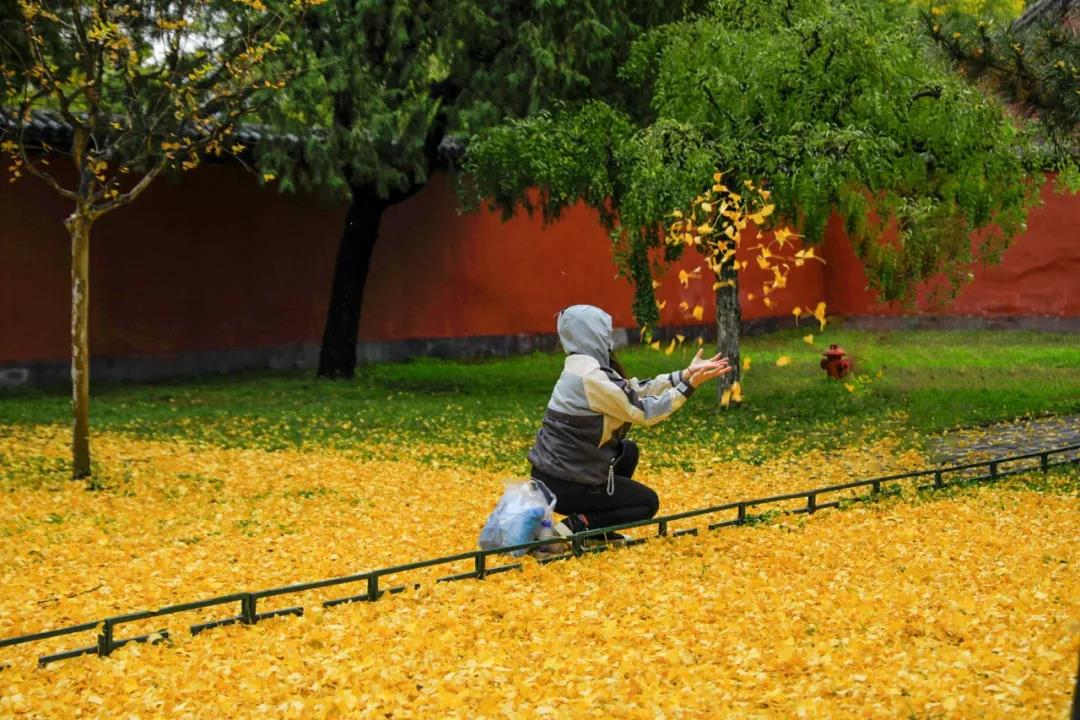 一片片银杏叶如同一把把小巧玲珑的扇子,微风吹过,发出“沙沙”的响声,叶子腾空而起,像是蝴蝶般四处飘飞。银杏叶落到板凳、石龟、石碑上,为古朴的岱庙增添了一抹亮黄,落到青石板上、草坪中,织就一条条金黄色或是块黄绿相间的地毯,让人不忍踏足。