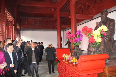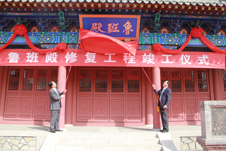 景区党工委书记谭业刚,泰安市人民政府特邀咨询、景区管委会主任李际山为“鲁班殿”揭匾