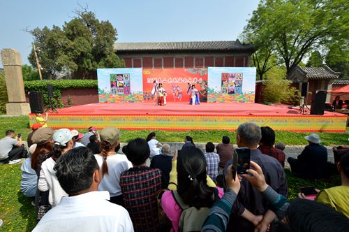 目前,2015’东岳庙会主题牌坊醒目的矗立在南北门,城墙上灯笼高悬、龙旗飘扬,院内各色艳丽花卉组摆的花坛,各民族和合共生的大团结版面……整个岱庙处处洋溢着欢乐、喜庆、祥和的气氛。正阳门外美食区,穿着民族服饰的摊主们热情的招揽着;进入正阳门,特色产品区、传统手工艺区、茶博会的摊主们也都已经就位;非物质文化展演区内,来自台湾和韩国的艺人们也在提前走台,热情的观众们时不时爆来一阵热烈的掌声;雨花道院的奇石根雕也都翘首弄姿,热情地等待着来自四面八方的游客……
