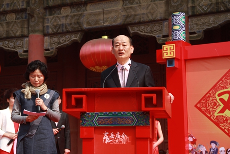 谭业刚在致辞中指出:泰山是“国泰民安”的象征,被誉为中华历史文化的缩影、中华民族的精神家园,也是首例世界文化与自然双遗产、世界地质公园、首批国家级风景名胜区、首批全国文明风景旅游区、首批国家5A级旅游景区。泰山文化博大精深、源远流长。作为国家级非物质文化遗产的泰山东岳庙会,是泰山最具生命活力的民俗文化景观和中国最具代表性的庙会之一。近年来,泰山景区在泰安市委、市政府正确领导下,高度重视泰山东岳庙会文化的保护、挖掘与传承,按照把泰山办成海峡两岸及国际具有特殊影响力的祈福圣地这一目标,以弘扬、展示泰山文化为核心,不断创新形式,提升品位,拓展领域,做强文化产品,做大文化产业,为打响“登泰山 保平安”品牌注入了新的元素和内涵。同时,通过泰山东岳庙会的连续成功举办,搭建了泰山、泰安与台湾地区互信共赢的“国家级海峡两岸交流基地”这一高规格平台;通过泰山东岳庙会这个纽带,有力促进了泰山、泰安与韩国的国际间交流与合作。本届庙会以“逛东岳庙会 祈平安福贵”为主题,在挖掘提升往届特色项目的基础上,引入华夏各民族“和合共生”的主旋律,突出海峡两岸文化交流及中韩之间旅游商贸合作,策划组织开展非物质文化展示、民族美食节、民族歌舞表演、民族商品展销等12项特色文化、旅游、经贸活动。我们也诚恳希望以此为契机,推进泰山文化的传播、泰山精神的弘扬和宝贵非物质文化遗产的永续传承利用,在更深层次、更广领域开辟海峡两岸、中韩两国合作交流的新格局。