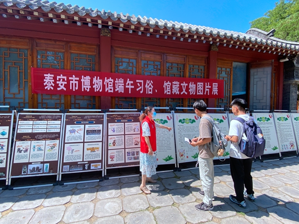 在汉柏院设置宣传咨询台,免费向游客发放泰山文化方面的宣传资料,回答游客咨询。制作端午习俗、馆藏文物图片展板,介绍端午由来及各地端午习俗、馆藏文物等,让游客了解端午的民俗特色,感受泰安的民俗风情和泰山文化。