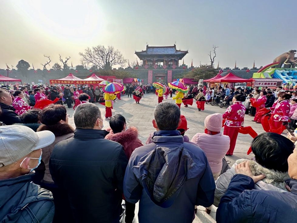 喜庆的锣鼓敲起来,欢快的舞蹈扭起来!扭秧歌、划旱船、骑毛驴……民间社火花会巡演成为春节岱庙出彩的“显眼包”。表演团队憨态可掬的造型、喜庆到位的表情管理,感染了在场的每位观众,游客的称赞声不绝于耳,掀起了阵阵热潮。