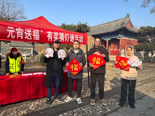在雨花道院,悬挂在空中的五彩谜语吸引着市民和游客踊跃参与。每位成功猜中谜题的参与者都能获得一份岱庙特色“福”礼。活动现场欢声笑语不断,既考验了参与者的智慧,也让元宵节的氛围愈发浓厚热烈。