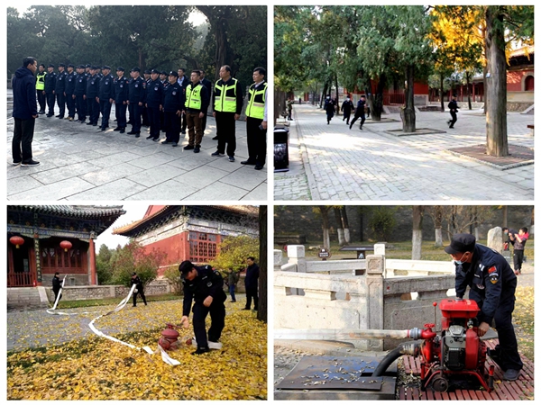 为提高文物古建筑火险应急处置能力,切实做好消防安全工作,把各种安全隐患消除在萌芽状态,真正做到“防患于未然”。在第29个消防宣传月之际,博物馆按照“安全第一、预防为主、综合治理、防消结合”的工作方针,组织岱庙灭火突击队、泰山东岳旅游集团经营人员开展了消防演练活动,相关人员进行了观摩学习。