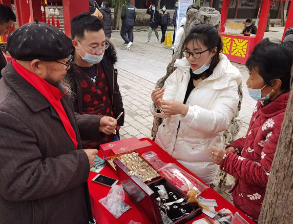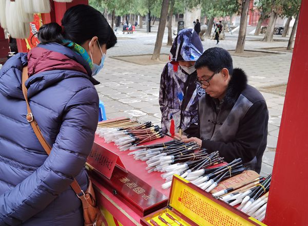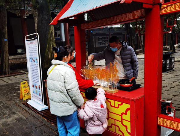 按照泰山景区疫情防控工作要求,岱庙景区于大年初一初二实行“限量、预约、错峰”南进北出单向游览。在平稳、有序度过客流高峰后,为丰富群众文化生活,传承和弘扬优秀传统文化,营造快乐、喜庆、祥和的节日气氛,景区于初三至初六在阁老池前举办泰山糖画、泰山老银匠、手工制笔、陶埙等传统非遗项目展示。