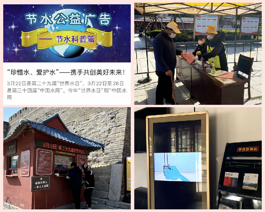 活动充分利用岱庙微信公众号、岱庙南北门LED屏和游客中心显示屏等多种媒体形式,循环播放节约用水宣传标语和视频宣传片,组织人员在岱庙南北门入口向游客市民发放节约用水倡议书,推动大家形成关心水、亲近水、爱护水、节约水的良好风尚。同时在馆内号召所有职工积极参与到国家节水行动中来,践行生态文明思想,增强节水意识,从点滴、从日常生活细节做起,改变浪费水的行为,养成节水型生产生活方式,为节水型社会建设做出应有的贡献。
