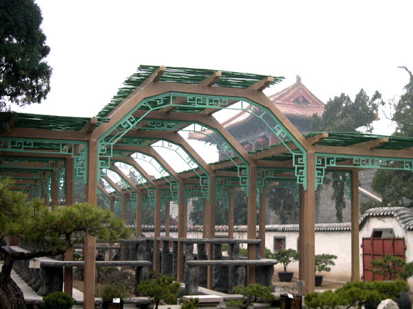 (维修前的东花园凉棚) 岱庙东花园凉棚建于上世纪70年代,立柱及横梁均为钢筋混凝土预制构件,由于年久失修,钢筋外露,腐蚀严重,混凝土大量脱落,大部分构件摇摇欲坠,失去承载力,给架下名贵盆景及过往游客带来极大的安全隐患。 8月,泰山管委规划局和博物馆的工作人员及时进行现场勘察,将其列入2009年管委重点维修项目,采取找投标方式,选择了有资质的施工队伍,实施了抢救性维修。