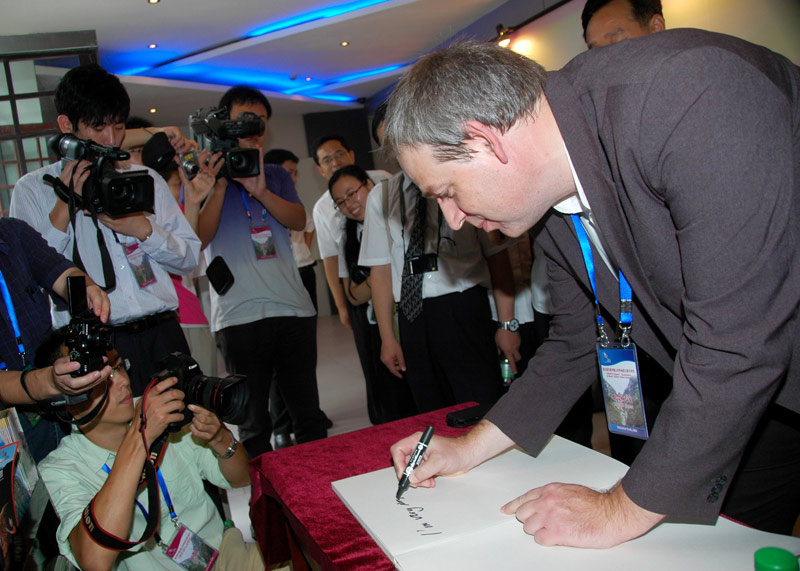 在泰山世界地质公园博物馆,两位联合国专家不时被里边丰富翔实的展出内容和泰山分布众多的岩石标本所吸引,看到一些稀有的岩石标本,蒂姆·克鲁迪格还会用数码相机及时拍下记录。“在这里我们对泰山地质的分布及特点有了更加全面的认识和了解。”亨宁·泽尔默表示。在参观即将结束之时,两位联合国专家欣然题词。其中,亨宁·泽尔默用英文写下,“我对泰山地质公园壮观的地质景观,非常有意义的地质内涵和生活在这个地方非常友善的人们,致以最衷心的祝愿。” 20日,考察团一行将继续对泰山中天门、南天门、后石坞地质遗迹景区进行参观考察,并于今天下午对中评估情况作出反馈。