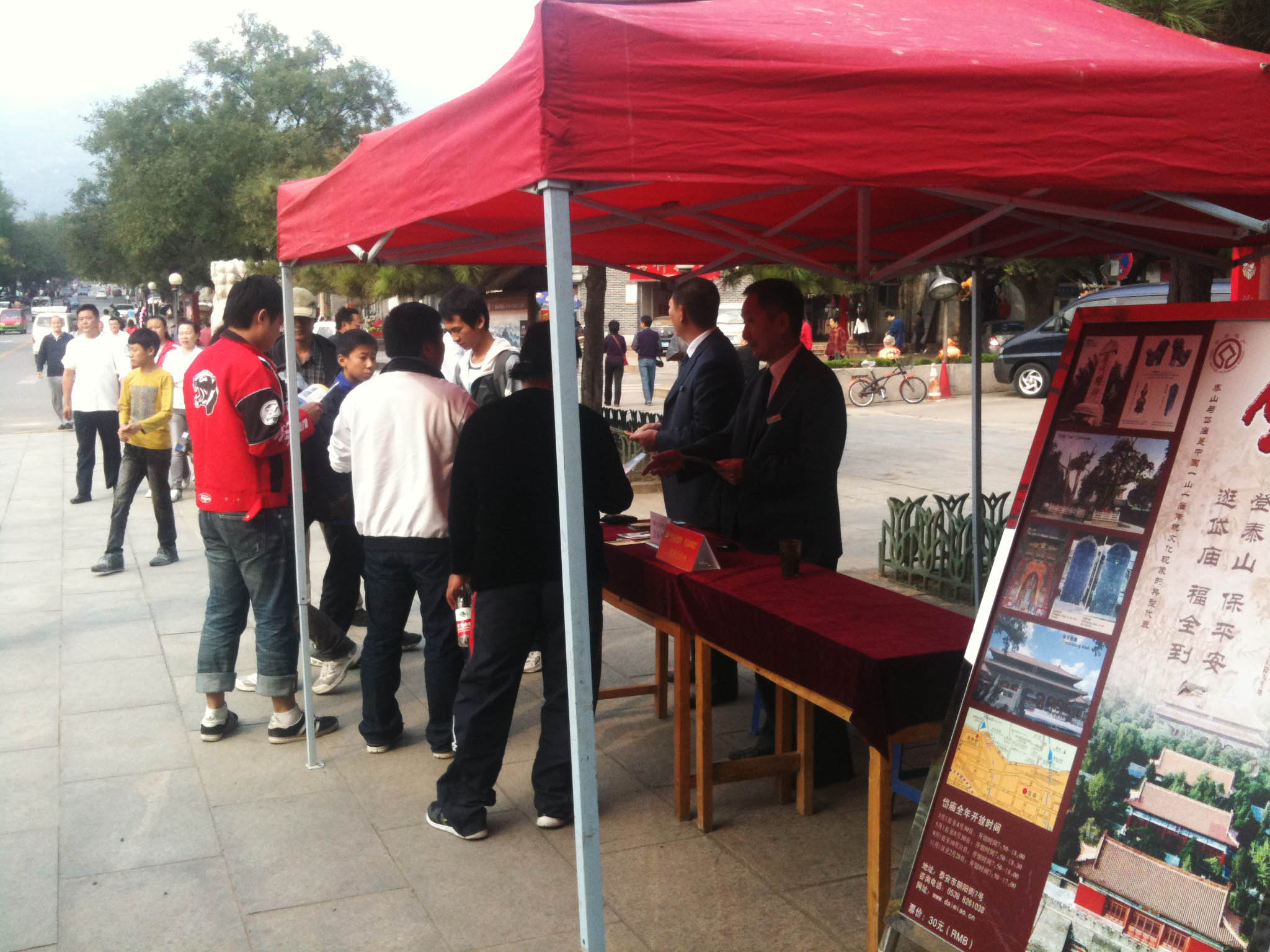 在岱庙厚载门设立党员示范岗和党员便民服务咨询站,通过为游客答疑解难、送水、寻人和提供医疗救助等项活动,方便了来游览的游客,深受游客的好评。