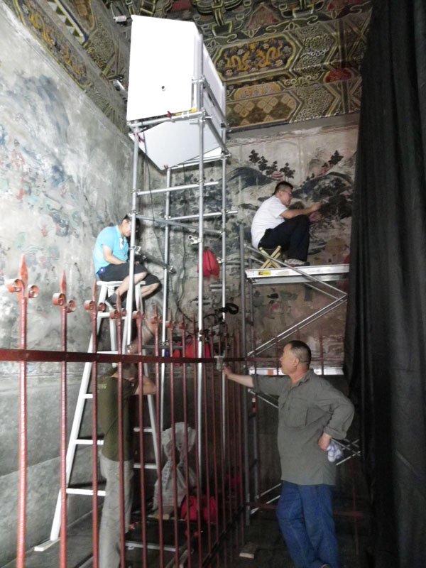 为确保壁画数字化拍摄质量,博物馆指派专业工作人员协调现场工作,配合施工方工作,为其提供方便,保证施工期间的正常用电、用水。为保证拍摄的精度要求,在拍摄现场周边围拦遮光布;在空间狭小的天贶殿壁画北墙面外侧搭设脚手架;拆除影响拍摄的铁护栏斜支撑等。
