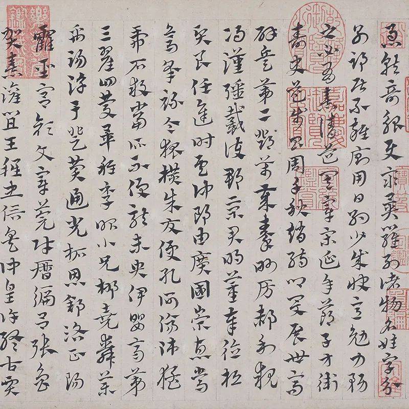 一幅书法作品的成功离不开纸张的功劳哦,这幅《千字文》书写在一张全长近12米,由宫廷画师一笔一笔绘成的描金云龙笺上。你们知道吗?制作一张描金云龙笺需要上百道工序。在当时的条件下,要生产这样长度的无接缝纸张,可能要在江边把船舶排列成行,然后浇上纸浆,待自然干燥,才能制成。因此,无论是书法的艺术价值还是制纸工艺,宋徽宗的草书《千字文》,都可以称上的是空前绝后的稀世杰作了。
