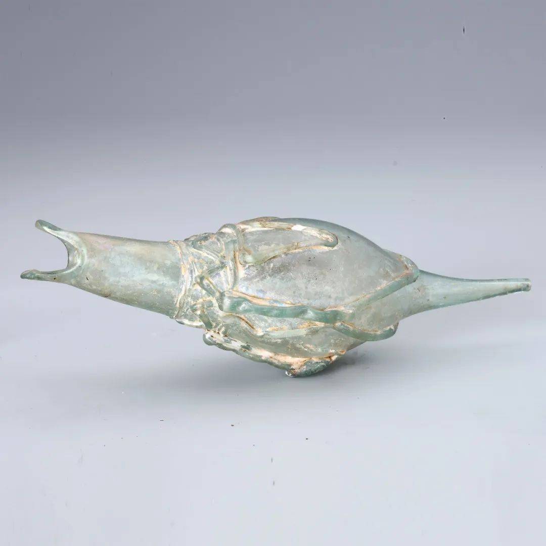 这件鸭形玻璃器便是早期玻璃制品的代表之作,它的造型似一只可爱的鸭子,由玻璃吹制而成。为了将鸭子的外形模仿得惟妙惟肖,这件器物在吹制完成后还采用了粘贴的方式,仿照鸭子脖颈的羽毛、三角形的翅膀、双足等,将雕琢后的玻璃条粘贴在鸭子身上。它还有个特别之处,那就是重心在前,只有腹部充水至半时,因后身加重,才得以放稳。如此奇特且罕见的动物造型的玻璃器,也并非中国的传统风格。那么它到底有哪些故事呢?经文物及历史专家研究推测,这件鸭形玻璃器应该是产于古罗马帝国,再途经草原丝绸之路传入北燕。众所周知,玻璃器易碎不便保存,从罗马帝国万里迢迢运到辽西,掩埋入土1500余年依旧保存完整,仅表面被浸蚀,不能不说是一个奇迹!它是研究草原丝绸之路的重要物证,见证了这样一段历史:随着古丝绸之路上商旅不绝,不同民族的文明相互交融、求同存异,书写了沿线各国相互尊重、共同发展的繁荣史诗,从而积淀了以和平合作、开放包容、互学互鉴、互利共赢为核心的丝路精神。