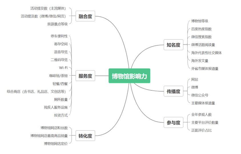 本评估体系共由两级指标构成,其中一级指标为知名度、传播度、参与度、融合度、服务度与转化度,六大指标下共设31个二级指标。