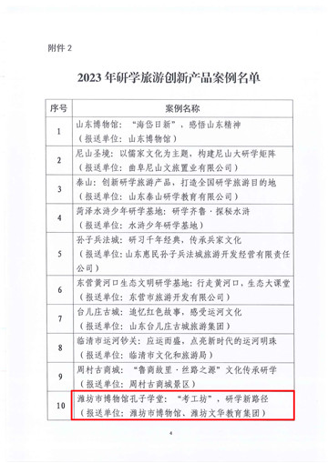近日,山东省文化和旅游厅印发《关于公布2023年山东省研学旅游创新案例的通知》,潍坊市博物馆申报的《潍坊市博物馆孔子学堂:“考工坊”,研学新路径》案例成功入选2023年山东省研学旅游创新产品案例。这是市博物馆为深度推动馆校教育共建研学游,利用好博物馆文物资源,发挥博物馆公共教育优势的一次创新实践。