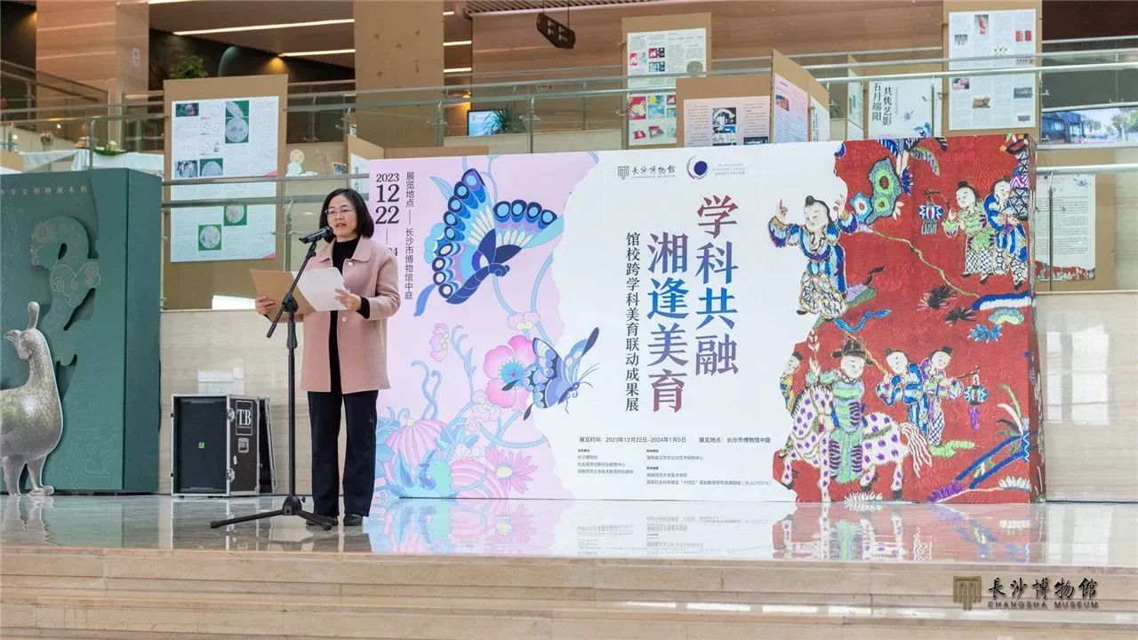 2023年12月22日,“学科共融 湘逢美育——馆校跨学科美育联动成果展示”在长沙博物馆中庭开放。展览开幕仪式上,长沙博物馆馆长周慧雯致辞,湖南师范大学副校长谢资清致辞,湖南省社科联党组成员、副主席贺建湘宣布展览开幕。出席活动的还有湖南省社科联、长沙市文旅广电局相关领导、同志,湖南省、市美育相关机构负责同志、专家、工作人员等百余人。