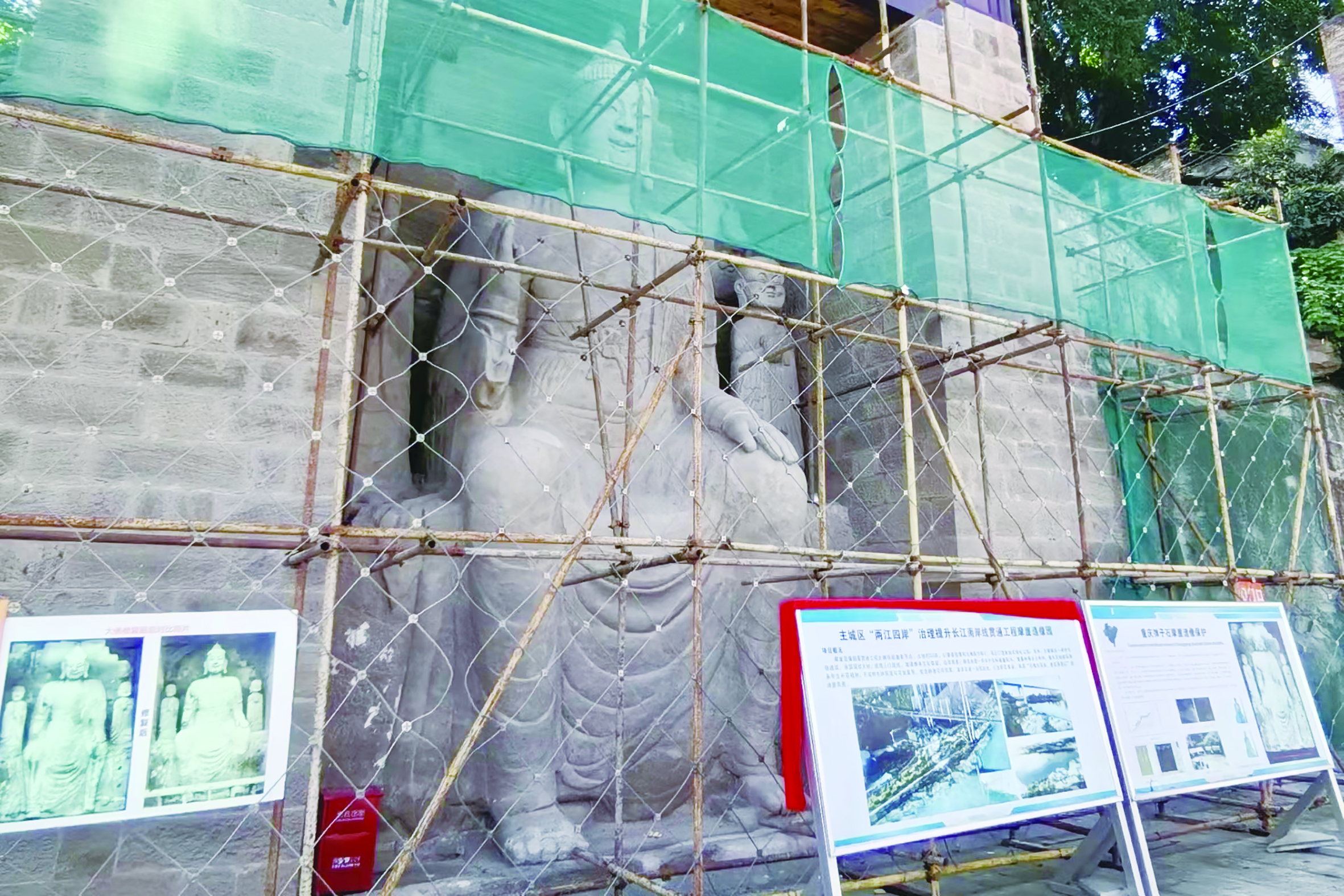 强降雨间隙,重庆忠县文物部门 组织对文物依托崖壁进行临时支撑加固。