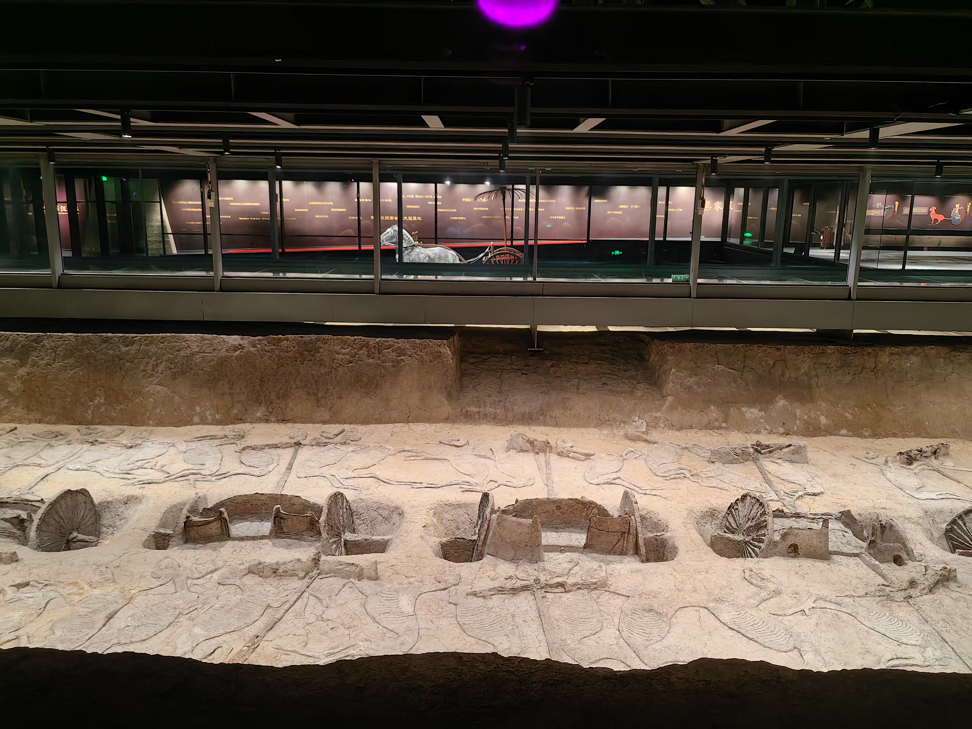 1号车马坑最北端的长槽,在2006年发掘青铜器200余件,这些青铜器都是车马上面的配件,这里相当于古人设计马车的配件仓库。